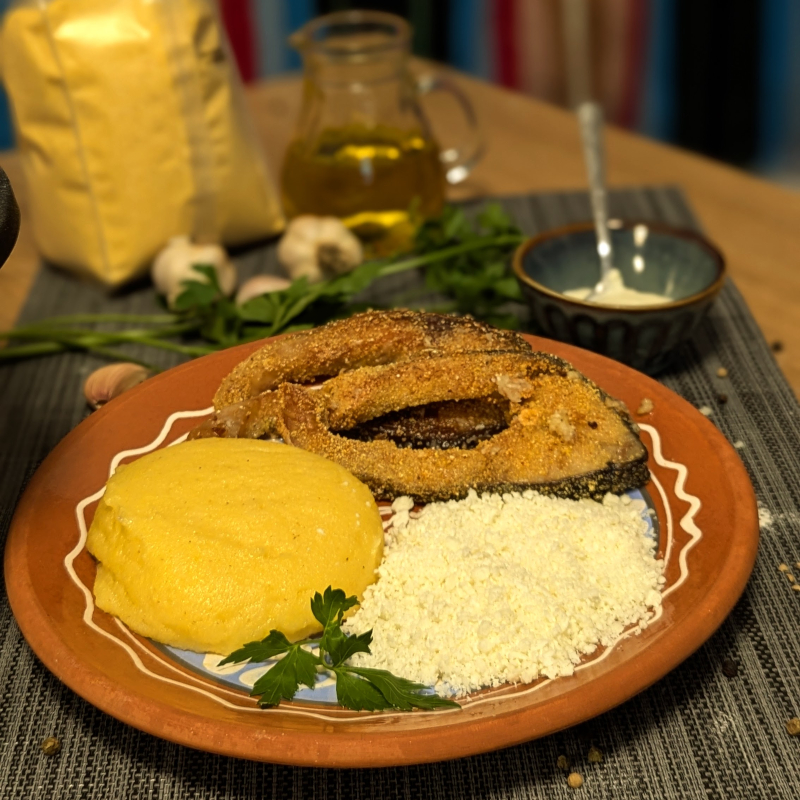 fried fish (carp), polenta, sheep cheese, mujdei, sour cream